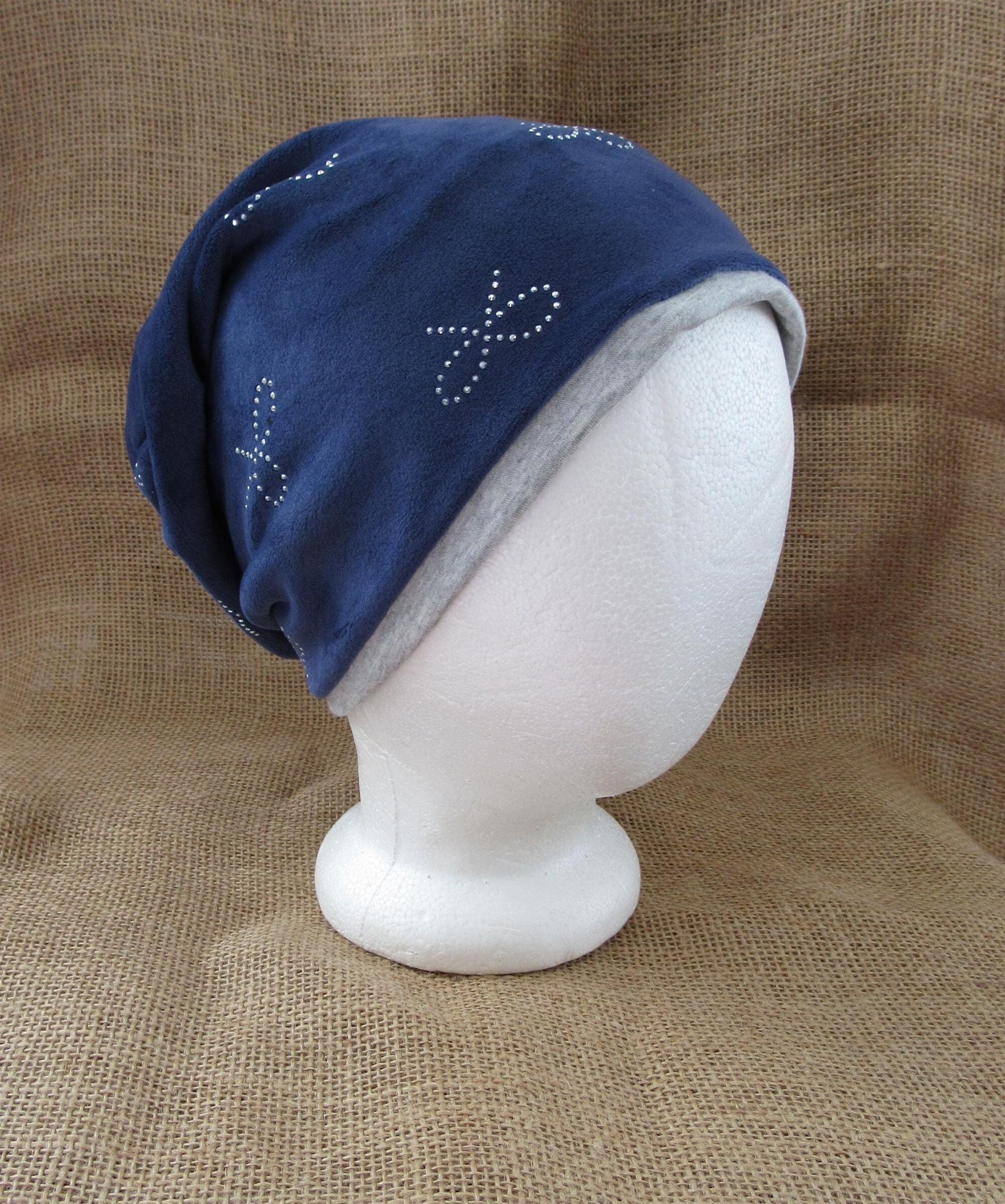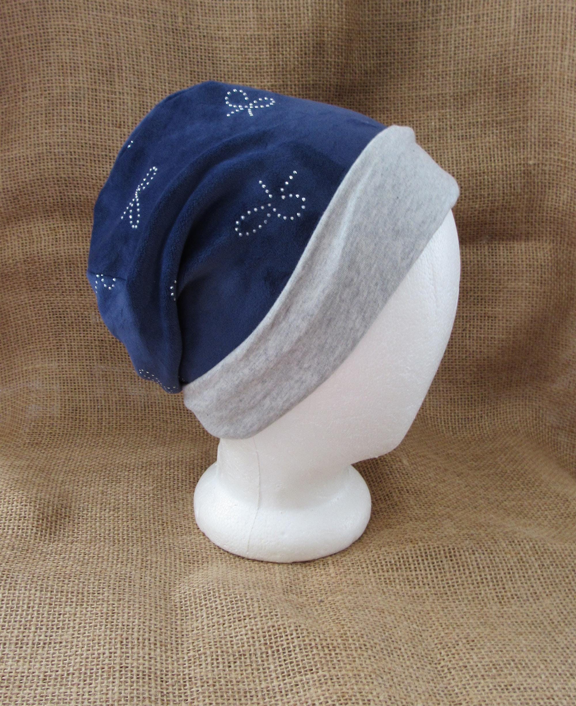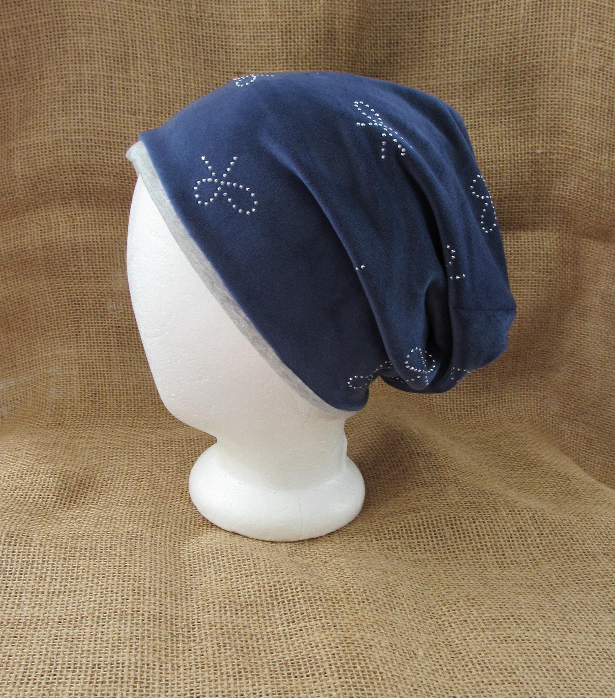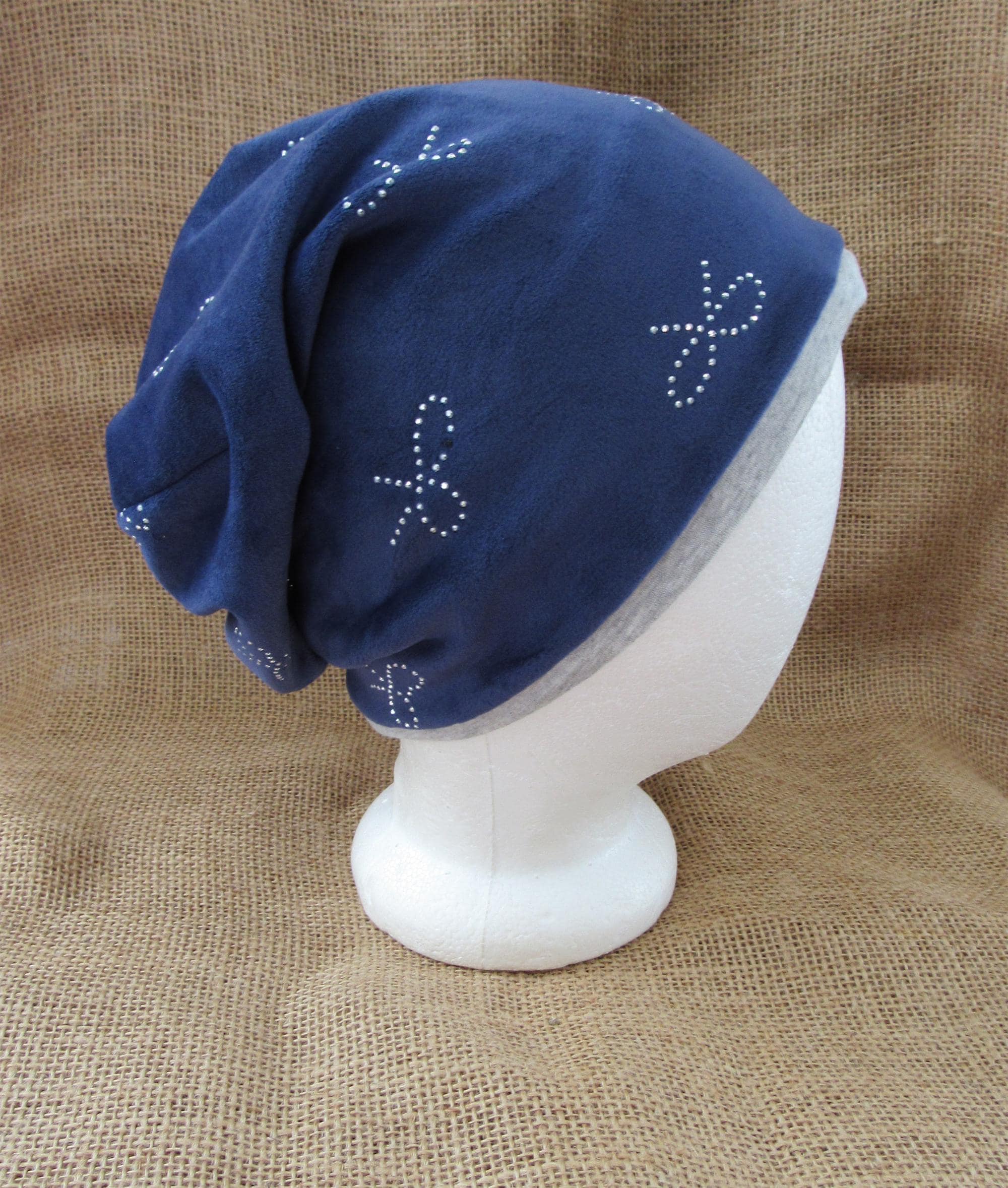 Add a little sparkle with this beautiful soft blue micro velour chemo slouch beanie.  This warm hat features sparkling bows with light heather gray bamboo fabric lining. Perfect for the holidays, or any day you want to shine :)